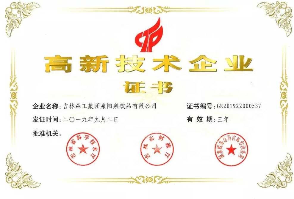 ? ? ? 根據科學技術廳、吉林省財政廳、國家稅務總局聯合頒布的《關于公布吉林省2019年第一批國家高新技術企業認定結果的通知》,經過層層審核,吉林森工集團泉陽泉飲品有限公司由吉林省科學技術廳、吉林省財政廳、北京市國家稅務局、國家稅務總局吉林省稅務局局聯合批準下發的高新技術企業認定。
